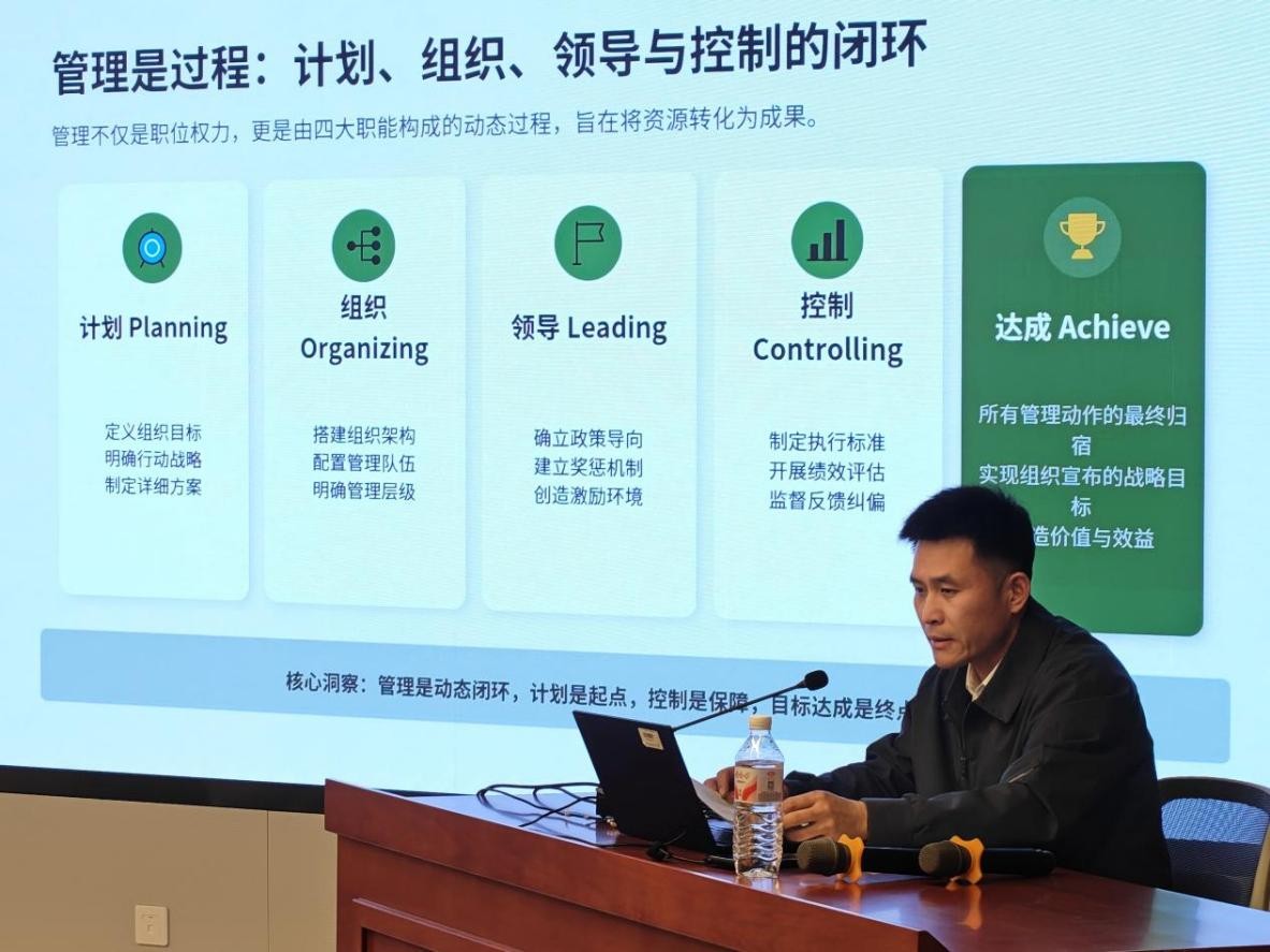 接着,朱明以《管理与管理者》为主题进行授课,从管理学原理、管理技巧以及工作思路三个方面入手,通过理论讲解和案例剖析,阐述了闭环管理与团队智慧在工作中的重要性,并系统讲解了“计划、组织、领导、控制”四位一体的工作思路,鼓励大家把握方向、善于统筹、敢于攻坚,强化服务意识,凝聚发展合力。